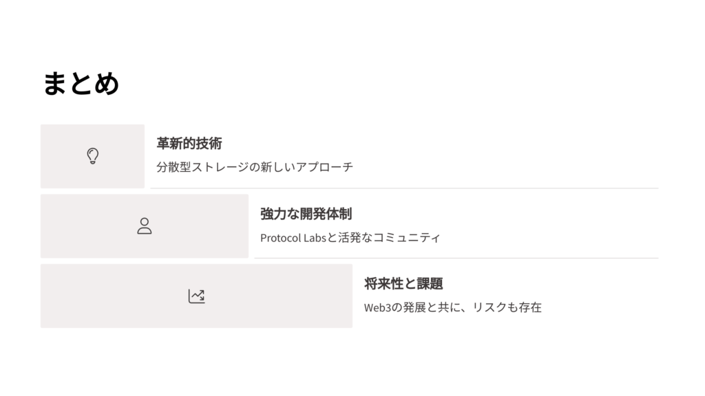 - 将来性: データ量の増大とWeb3の発展に伴う、分散型ストレージ市場での成長期待。