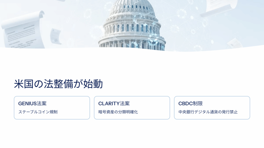 暗号資産市場が大きく変わろうとしている背景には、各国の規制整備があります。7月17日、米下院はドルと連動するステーブルコインに関する「GENIUS法案」や、暗号資産を証券・商品に分類する「CLARITY法案」、中央銀行デジタル通貨(CBDC)の発行を事実上禁止する法案を可決しました。これらの法案は、発行体に対して裏付け資産を100%保有し、準備資産を毎月開示することを義務づけています。