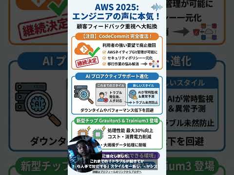 AWSが顧客の声を聞き入れた2025年のアップデートは、CodeCommitの復活からAI統合まで、技術者の生産性を革新します。これにより、クラウド開発の障壁が減り、より効率的なイノベーションが可能になります。あなたの実務に即座に取り入れてみてください。
