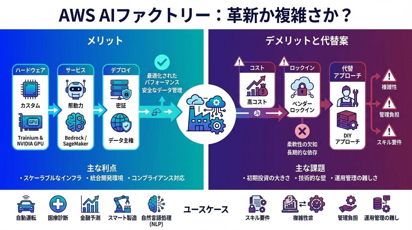 AWS AI Factoriesは革新の可能性を秘めつつ、複雑化の罠も。ビジネス視点で分析した結果、独自構築が長期ROIを最大化する道です。ニュースの警告を活かし、賢い選択を。