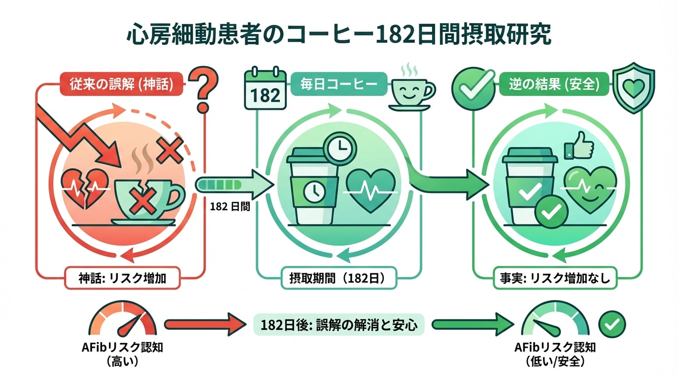 | カフェインの影響 | 心臓を刺激し、不整脈を悪化させる敵 | 適量なら再発リスク39%減! 血圧調整・炎症抑制の味方 |