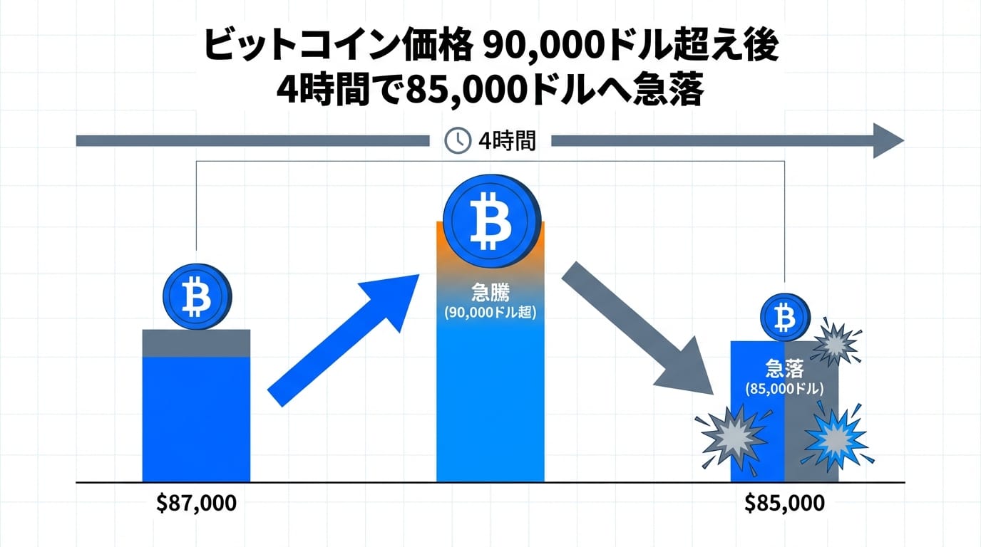 ビットコイン価格が90,000ドル超えから4時間で85,000ドルに急落!何が起きたのか徹底分析