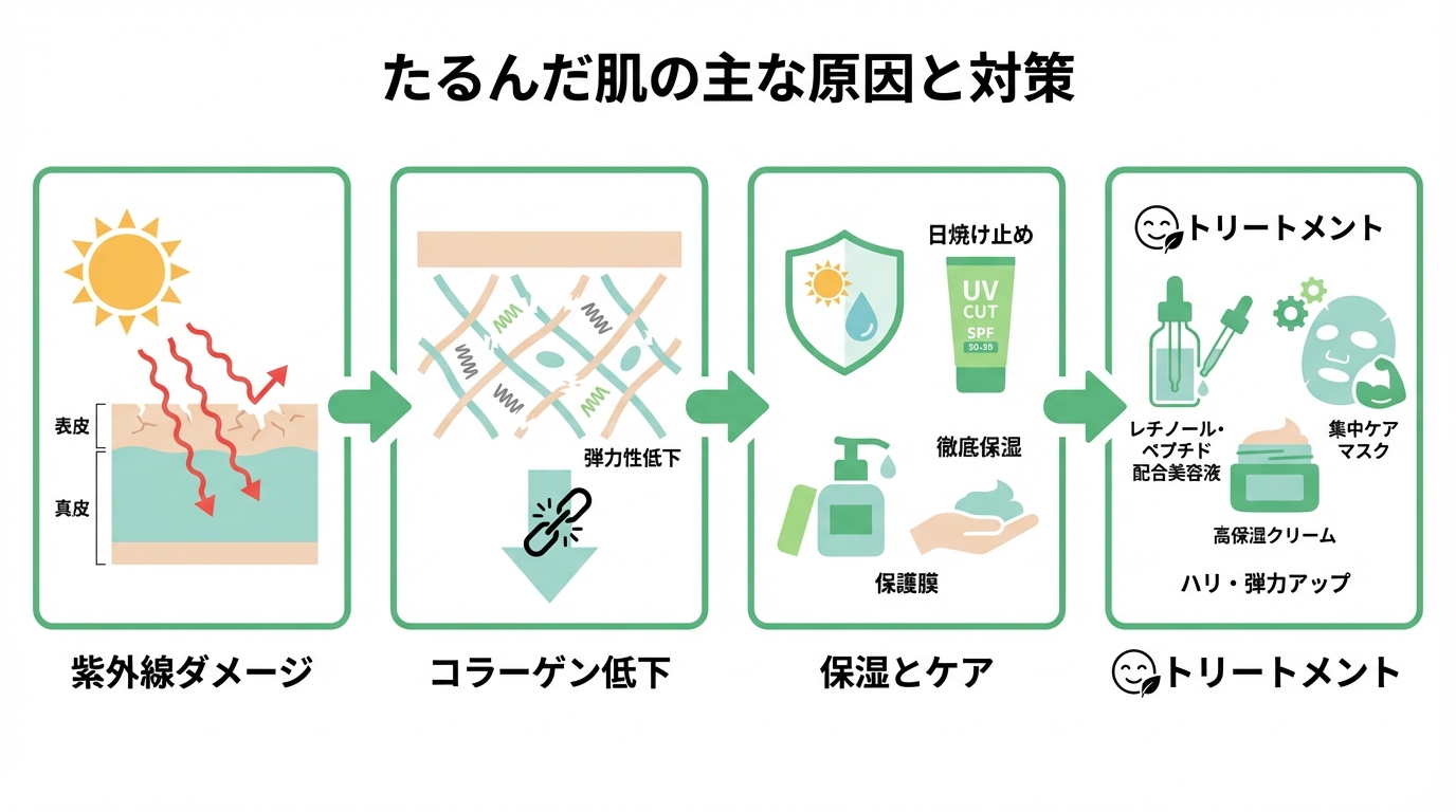 | 特徴 | クリームやローションで表面を保湿。即効性はあるが一時的。 | コラーゲン生産を促進し、根本原因に働きかける。持続的効果。 |