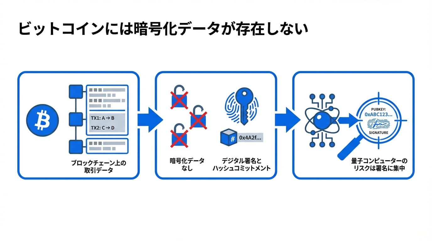 さて、核心に突入! ニュースのポイントはシンプル:ビットコインに「暗号化されたデータ」はない。だから量子コンピュータが解読する対象がないんだ。例えると、銀行の金庫に「暗号文」じゃなくて「指紋認証のハンコ」みたいなものが入ってるイメージ。