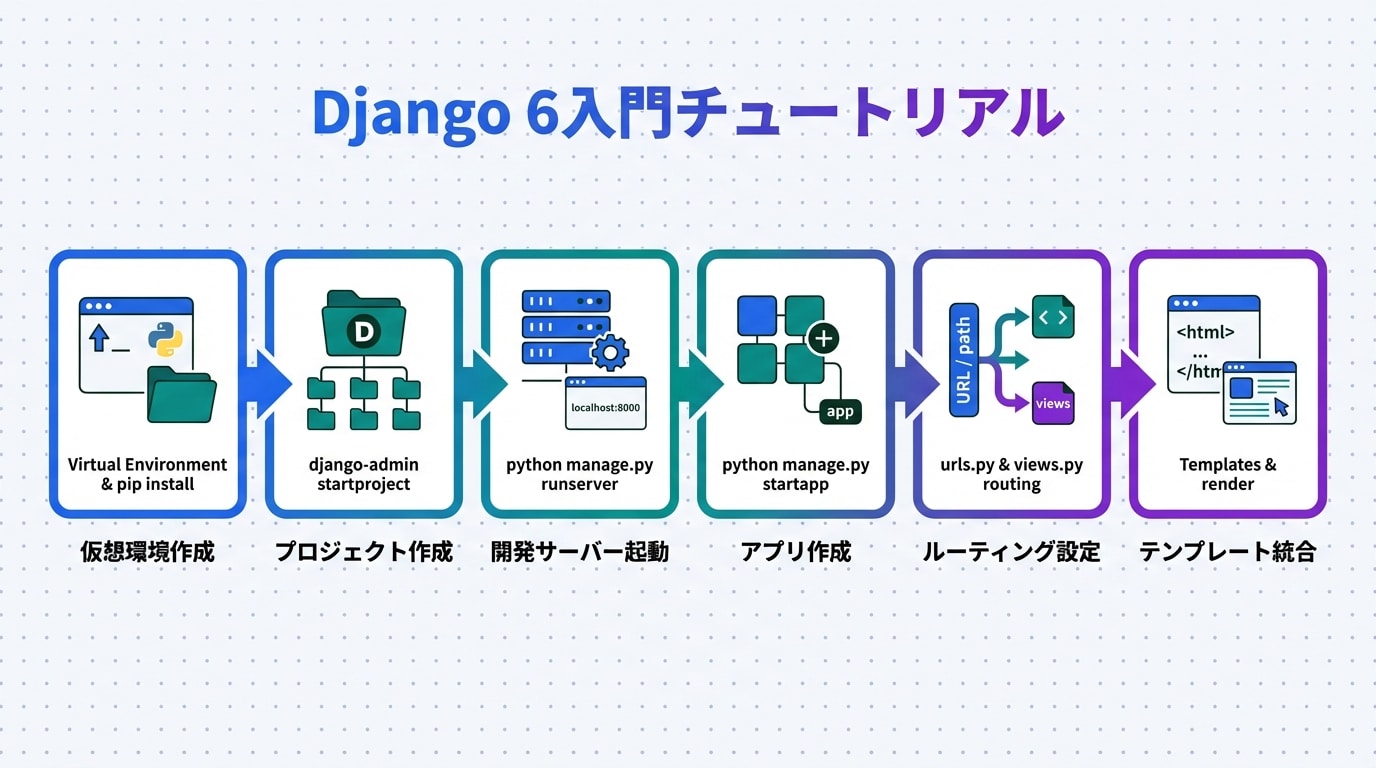 Django 6のチュートリアルは、基本的なルート設定、ビュー作成、テンプレートの活用から始まり、新機能の統合をカバーしています。技術者向けに、仕組みの詳細とコード例を交えつつ解説します。まず、概要イメージをご覧ください。