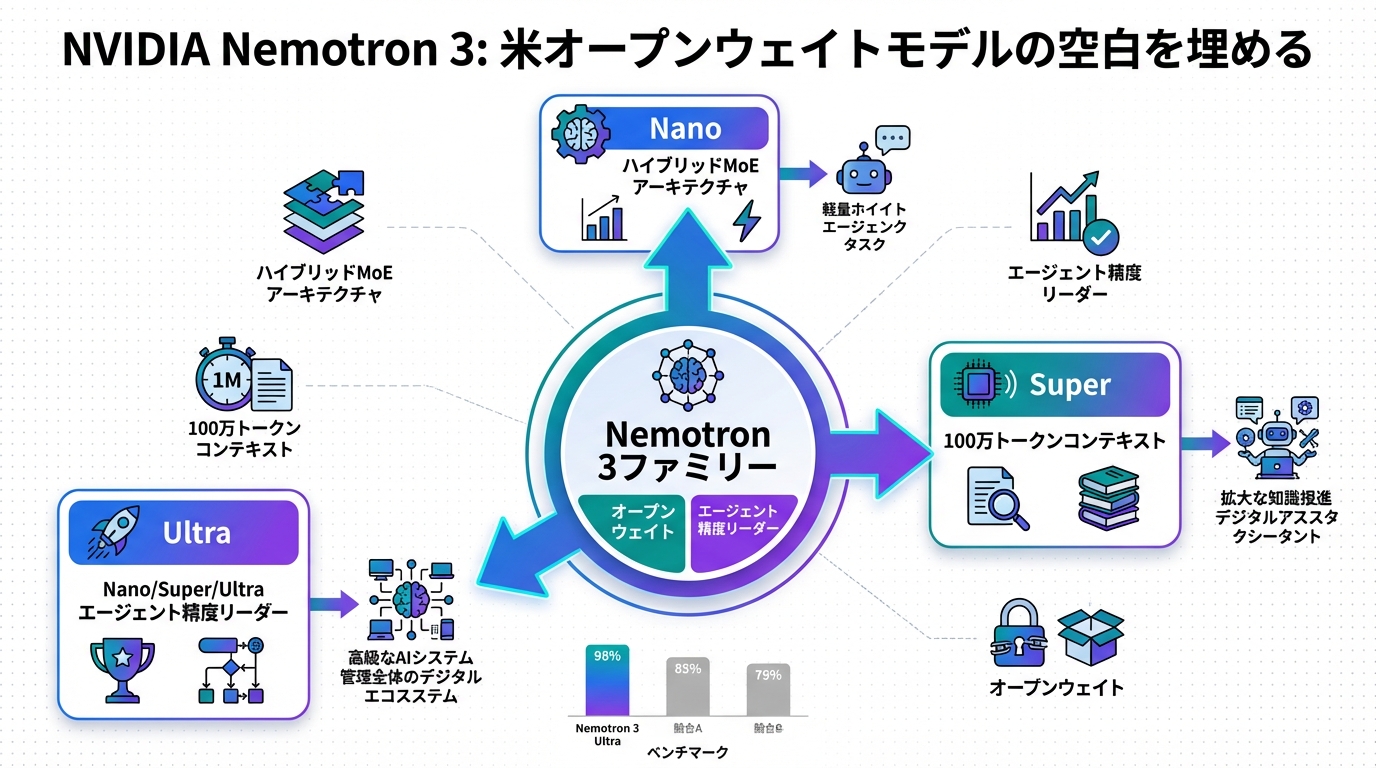 Nvidiaが発表したNemotron 3ファミリーは、オープンソースAIモデルの新時代を象徴します。このモデル群は、Nano、Super、Ultraのサイズで提供され、企業が効率的にAIエージェントを構築できるように設計されています。TechCrunchの報道によると、NvidiaはSchedMDの買収を通じてSlurmの開発を強化し、これを基盤にモデルを展開。透明性の高いトレーニングデータを強調しています。