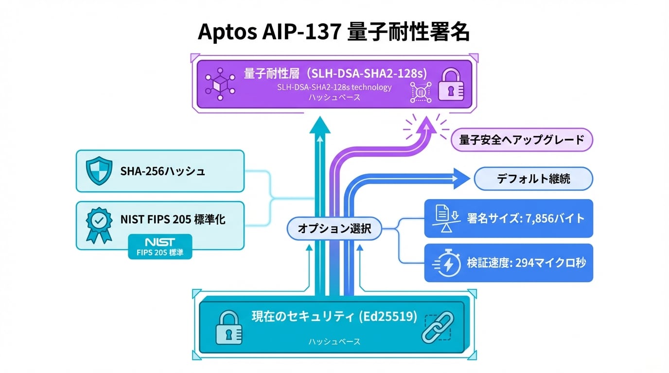 AptosのAIP-137は、SLH-DSA-SHA2-128sというハッシュベースのポスト量子署名スキームを導入します。これはNIST標準の量子耐性アルゴリズムで、既存のEd25519署名を補完するオプションです。