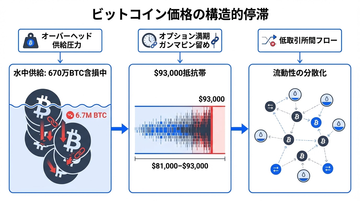 背景を簡単に。Bitcoinは2025年末現在、$90,000前後でウロウロ。みんなが期待する大ブレイクアウト(価格の急上昇)が見え隠れしてるのに、なぜか天井が低くて頭をぶつけるみたいな感じ。