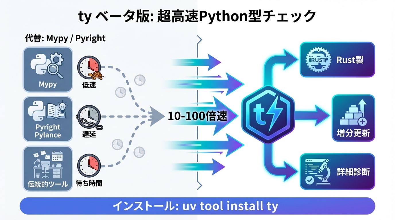 日々のコーディングで、mypyやPyrightの型チェックが遅くてストレス溜まっていませんか? 特に大規模プロジェクトでは、数分待つのが当たり前。そんな中、AstralがRustで書かれた高速型チェッカー「ty」をbeta公開。技術者として、これは無視できない進化です。ベンチマークでは60倍以上の速さを叩き出しているとか。あなたのワークフローを変える可能性大です。