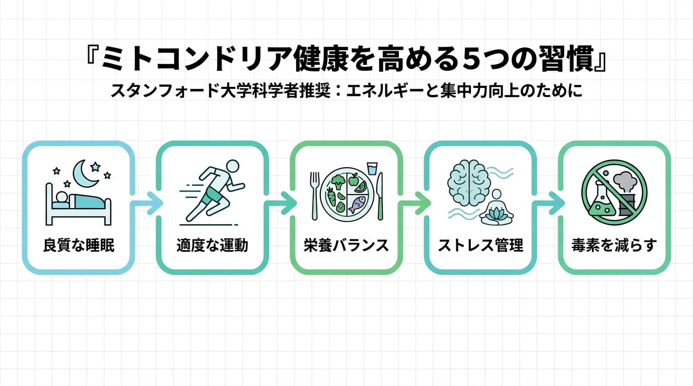 ここから本題! Stanfordの科学者(例: Dr. Martin PicardのPodcast参考)が勧める、ミトコンドリアをブーストする5つの生活習慣。専門用語は例え話で楽しく解説するよ。各方法に実用Tipsを添えて。