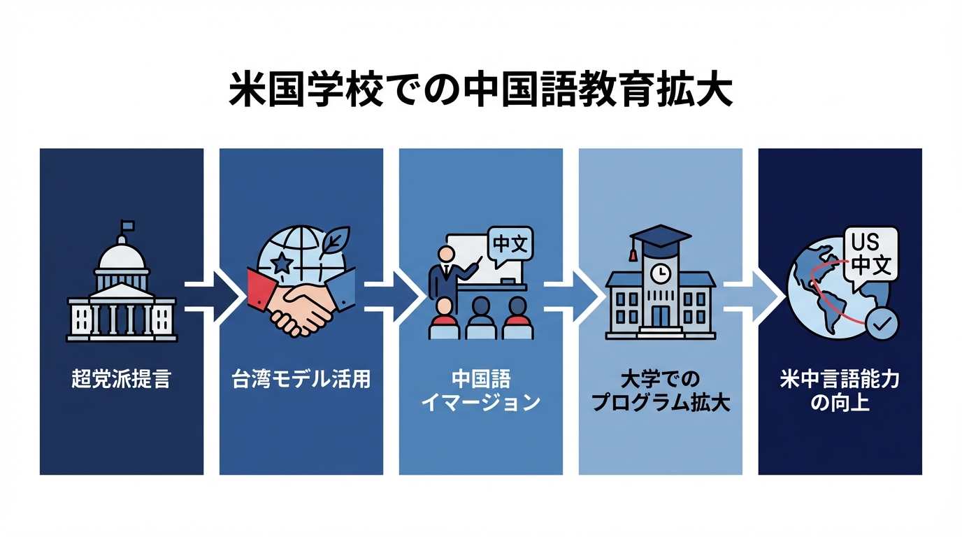 そんな中、ビ科院(Congressional-Executive Commission on China)が両党一致で提言を出したんだ。台湾の教育イニシアチブをモデルに、Mandarin(標準中国語)のイマージョン学習を拡大せよ、と。ジョーク混じりで言うと、昔の僕みたいに「英語しか話せない」状態で国際会議に行ったら、まるで「宇宙人と会話」してる気分だったよ(笑)。これを防ぐための動きさ。