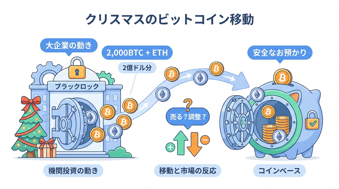 みなさん、こんにちは。Web3の世界って、ニュースを見ていても専門用語がいっぱいで、なんだか遠い話に感じませんか? 今日は、2025年12月25日から26日のニュースをまとめて、「仮想通貨の大移動」についてお話しします。特に、世界最大の資産運用会社ブラックロックが、クリスマスイブに大量のビットコインとイーサリアムを移したニュースが一番の注目点です。でも、これってただの「お金の移動」じゃないんです。そこには、市場の不安定さやセキュリティの問題が隠れているんですよ。