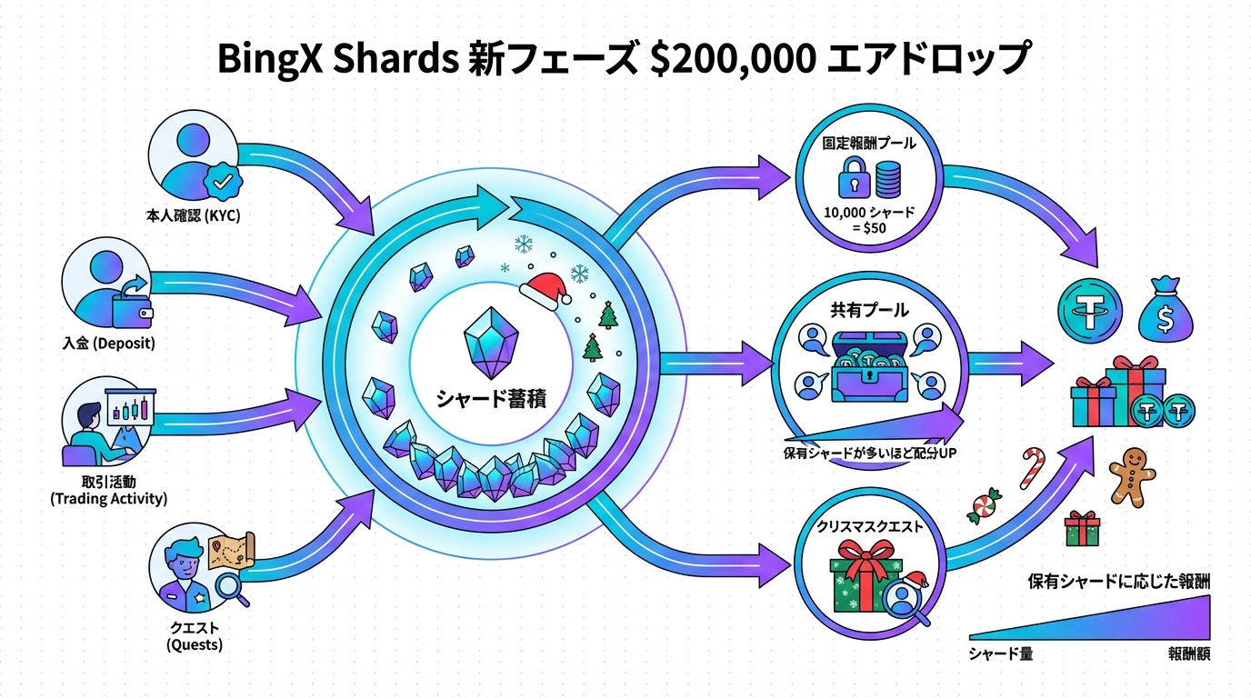 今回、BingXが発表したBingX Shardsの新フェーズは、$200,000の賞金プールを用意し、クリスマスシーズンに合わせたクエスト形式で注目を集めています。