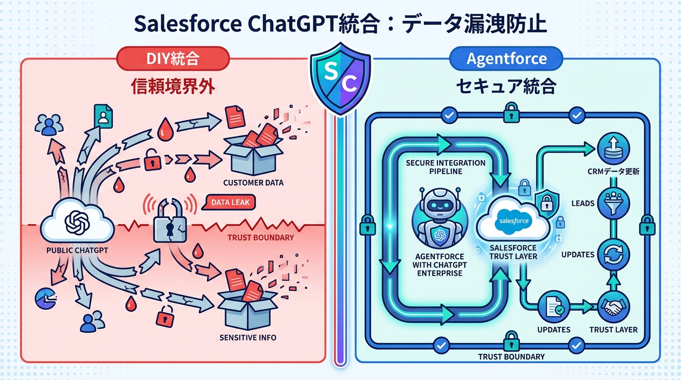 | データアクセス | ユーザーが手動でデータをコピーしてChatGPTに送信。権限無視の恐れ。 | Agentforce Trust Layerが既存権限を適用。許可されたデータのみアクセス。 |