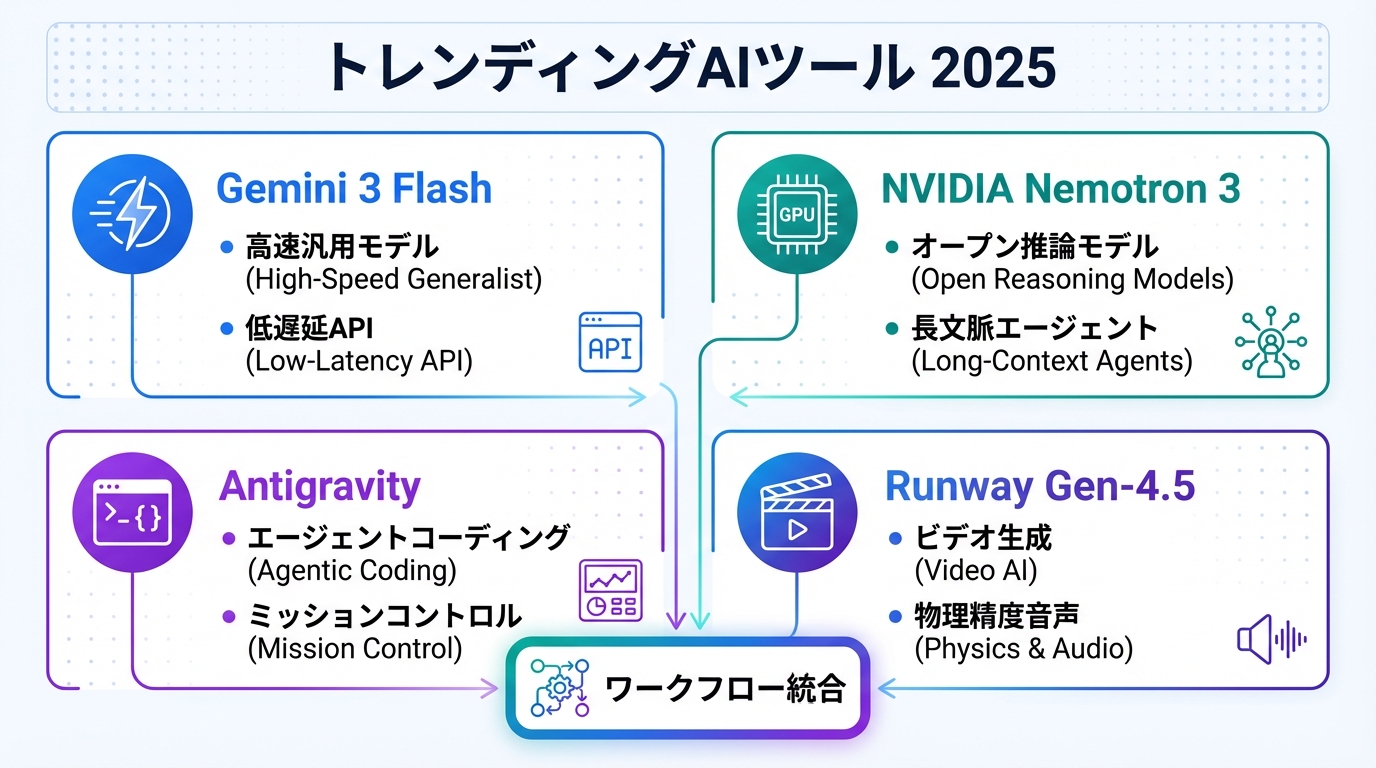 そんな中、2025年12月に話題になっているのが、Googleの「Gemini 3 Flash」です。これは、速さと安さを武器にしたAIで、日常の小さな手助けに特化しています。他にもNVIDIAのNemotron 3みたいに専門的なものや、Antigravityのようなプログラミングツール、Runwayの動画作成AIがありますが、今日は特にFlashに焦点を当てて、なぜ今これが注目されているのかを掘り下げます。問題はシンプル:AIを「もっと身近に、もっと速く」使いたいのに、既存のものは重くて高いんですよ。