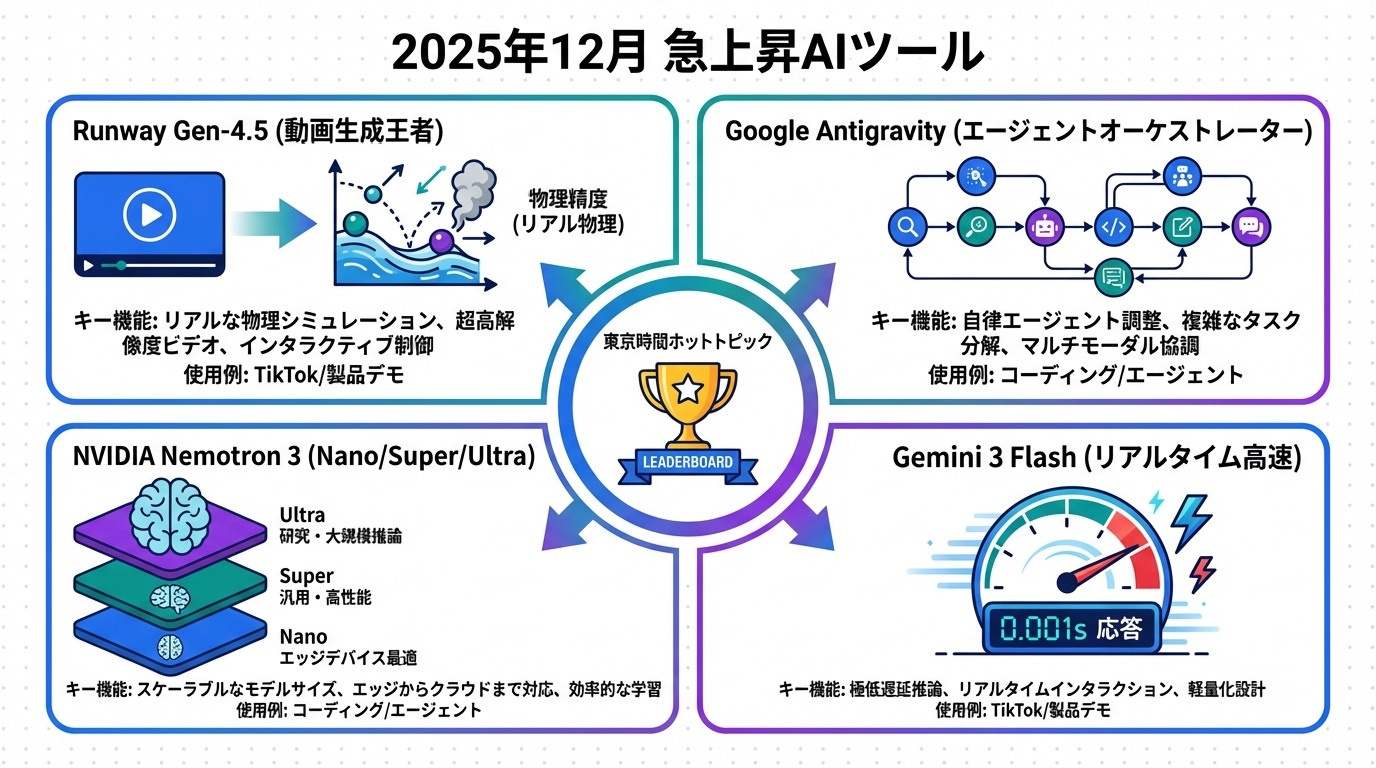 ニュースでは、GoogleのAntigravityやNVIDIAのNemotron 3も話題ですが、これらを組み合わせるとさらにパワーアップ。Antigravityはプログラミングをチームみたいに手伝ってくれ、Nemotronは長い会話のAIを作れる。Gemini 3 Flashは速い翻訳で日常を助けます。でも、Runwayが動画の中心で、生活を変えるインパクトが一番大きいですよ。