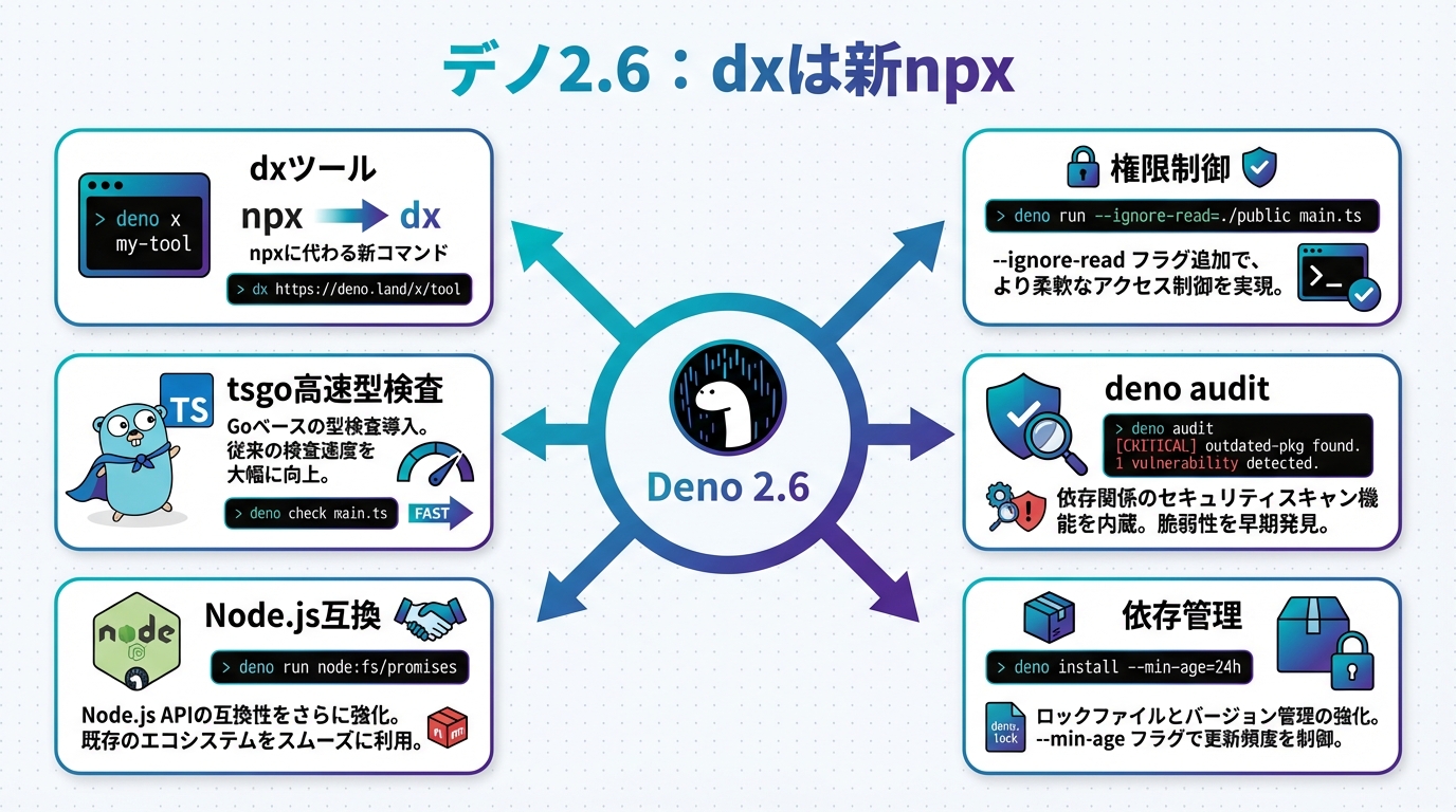 Deno 2.6のdxツールは、NPMとJSRのバイナリ実行を革新。セキュリティ強化と高速化で、技術者の日常を効率化します。