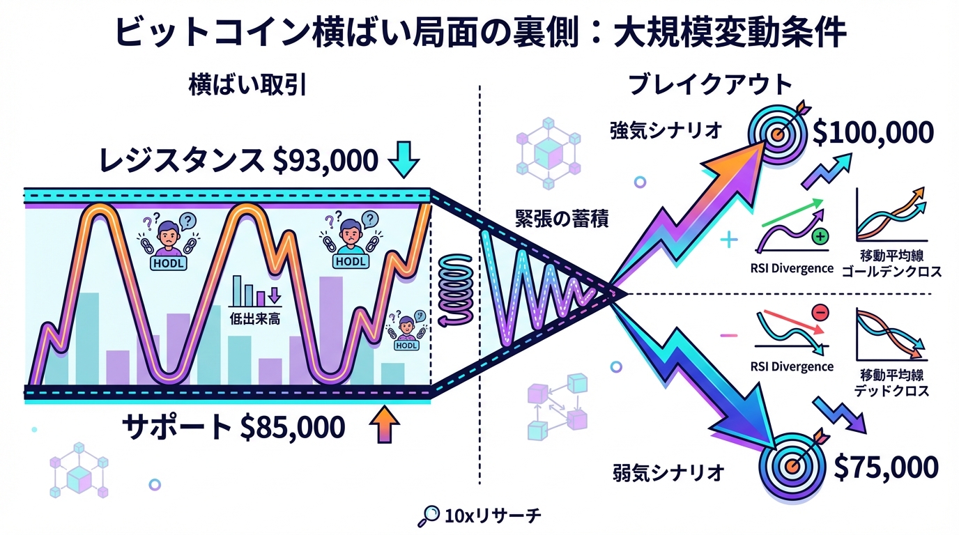 10x Researchの分析によると、この停滞は一時的で、特定の条件が揃えばmajor move(大きな動き)が起こり得ます。