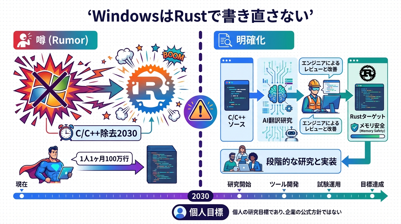 - 誤解の解消: Windows全体のRust書き換えはなく、内部研究プロジェクト。