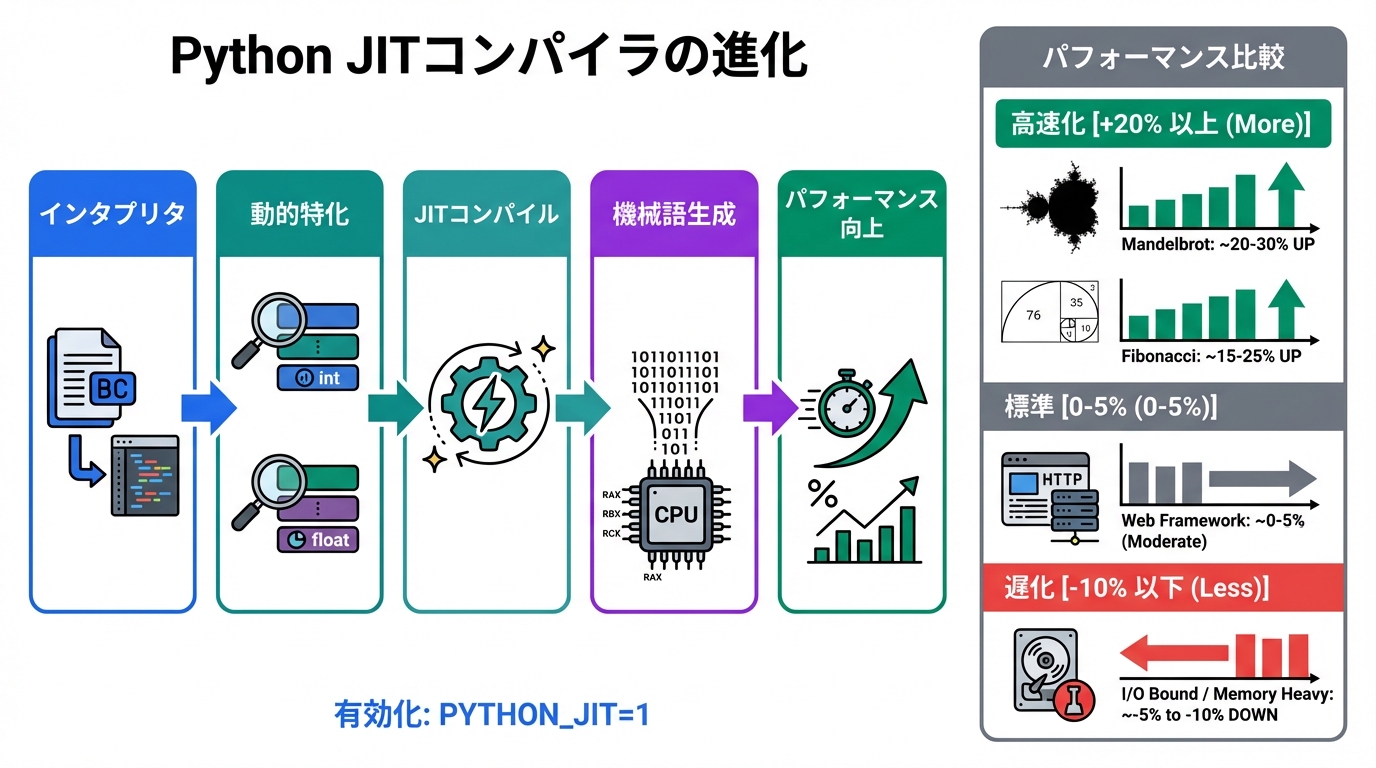 | 依存 | なし | Python 3.15+、–enable-jitフラグ |