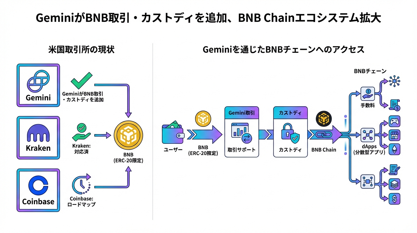 GeminiのBNB追加は、単に取引を可能にするだけでなく、カストディ(保管)サポートも含むため、安全性が向上します。BNBはBNB Chainのネイティブトークンで、ガス代支払いやステーキングに使われます。