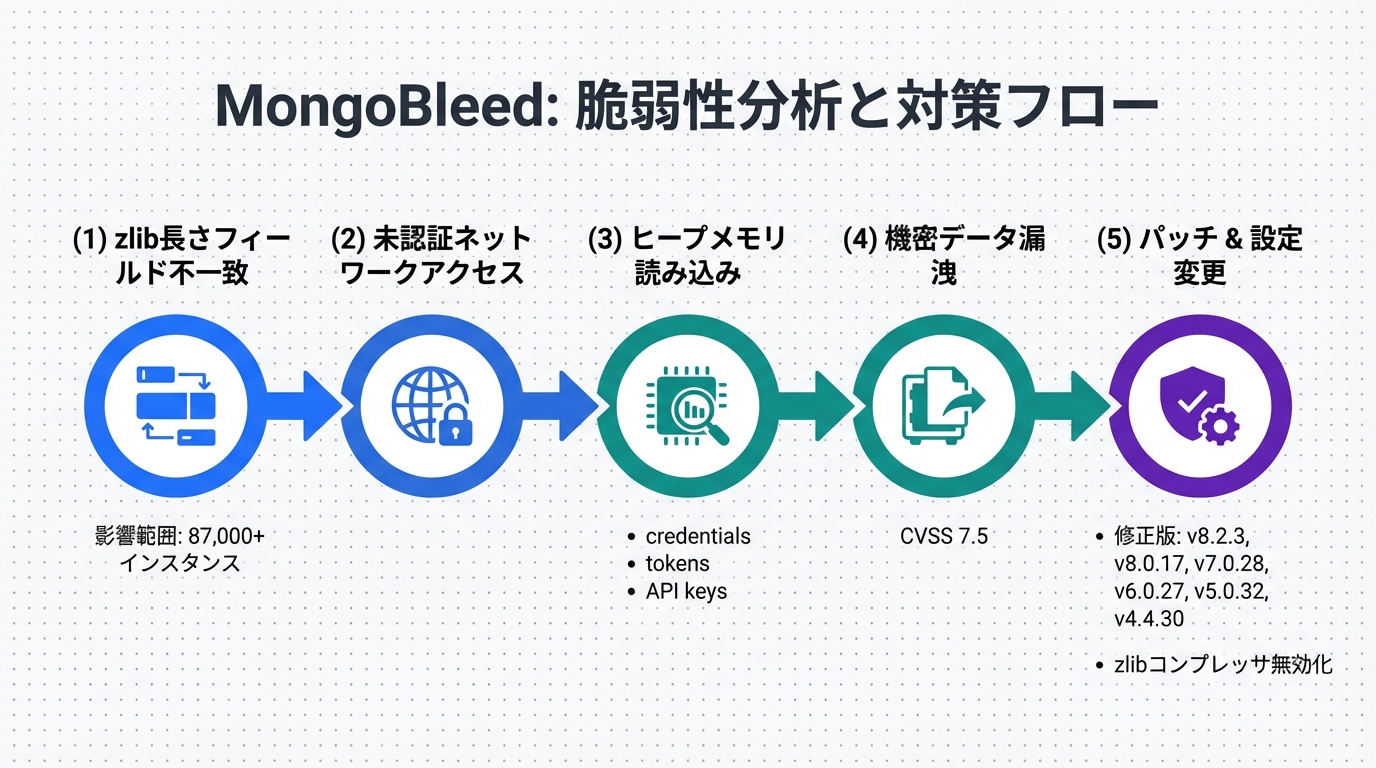 | 項目 | 従来のMongoDB(zlib有効時) | MongoBleed影響下 |