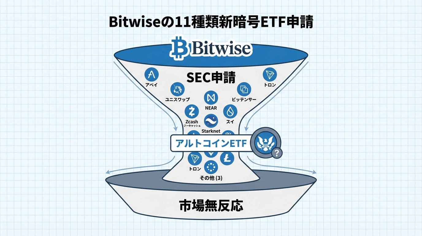 - 元ニュース:Bitwise just filed for 11 new crypto ETFs, and the market’s silence exposes a brutal new reality (CryptoSlate)