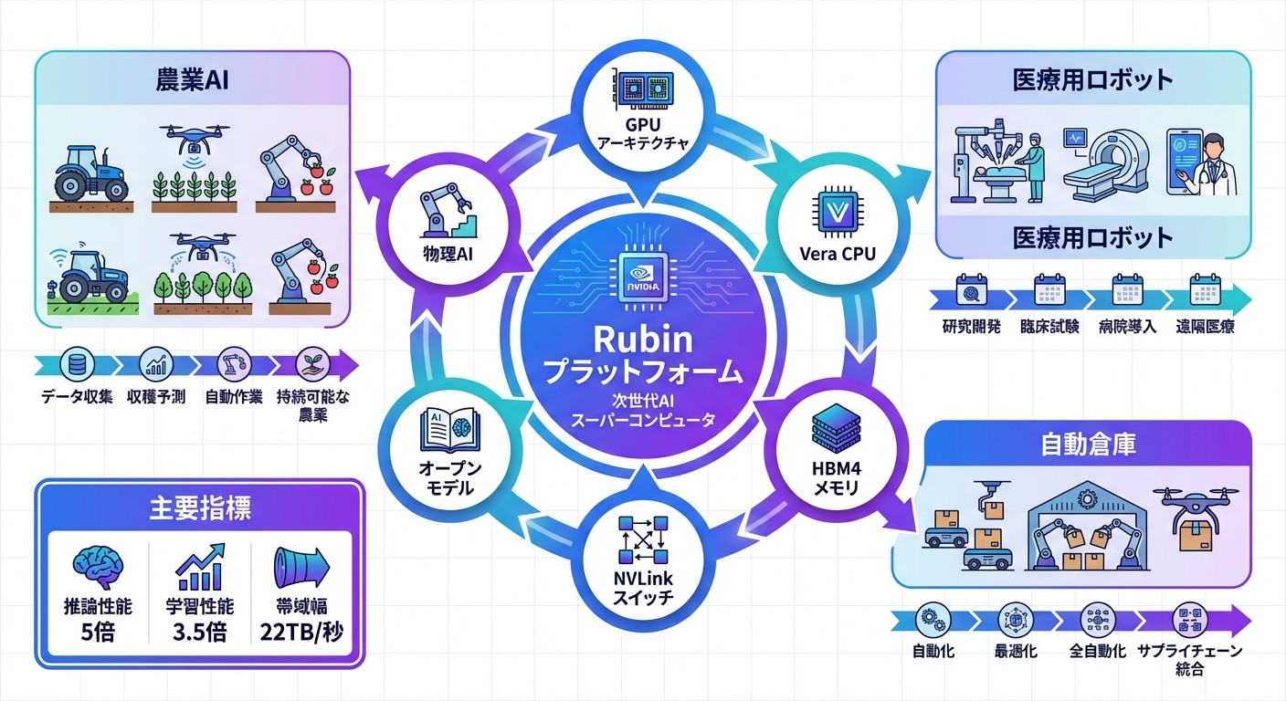 これまでのAIは、コンピューターの中でデータを処理するだけでしたが、今は「物理AI」と呼ばれる、現実世界で動くAIが注目されています。でも、学習に時間がかかりすぎて、数ヶ月かかる作業が普通でした。会社員の皆さんならわかるはず、プロジェクトの締め切りが迫ってるのに、ツールが遅いとイライラしますよね? そんな「遅くて高コスト」の壁を、NVIDIAのルビンがぶち壊すんです。