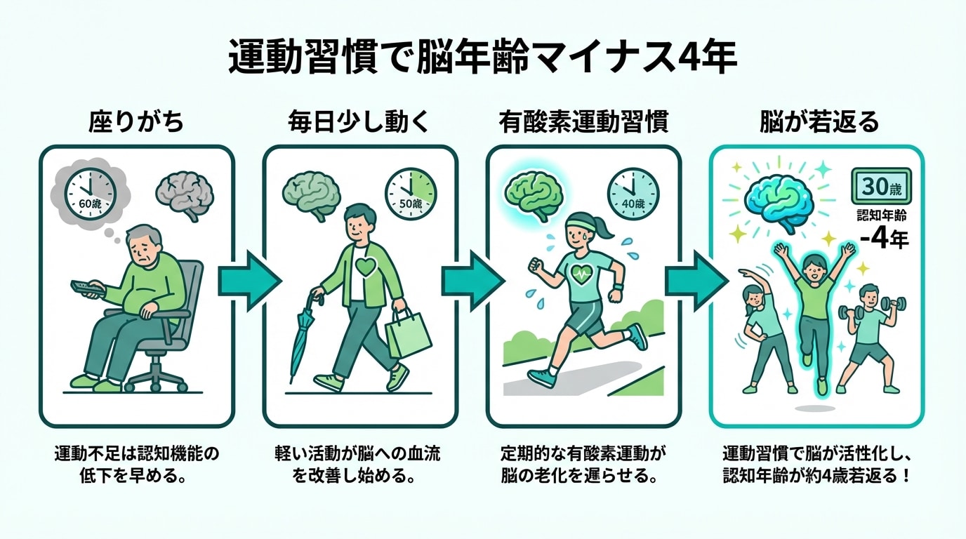 脳の衰えを感じたら有酸素運動が効果的かもしれません。研究によると認知年齢を4年若返らせる可能性があるそうです。散歩やジョギングで海馬を刺激する習慣は試す価値がありそうですね。#認知年齢 #有酸素運動