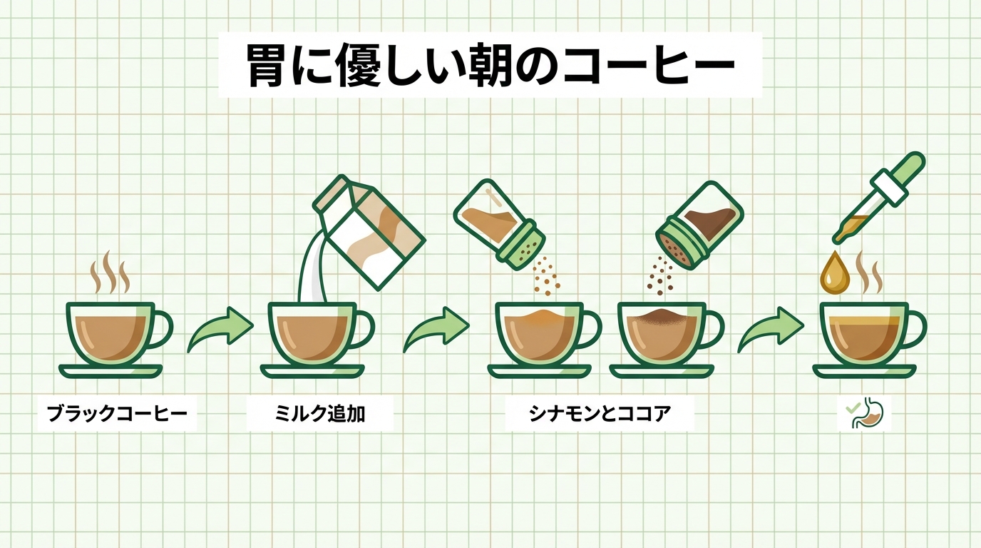 さらに、カフェインが腸の動きを活発にするから、下痢気味になる人も。日常例で言うと、仕事中の大事なミーティングで「お腹が…」ってなるのは避けたいよね? だからこそ、胃に優しい工夫が必要なんだ。