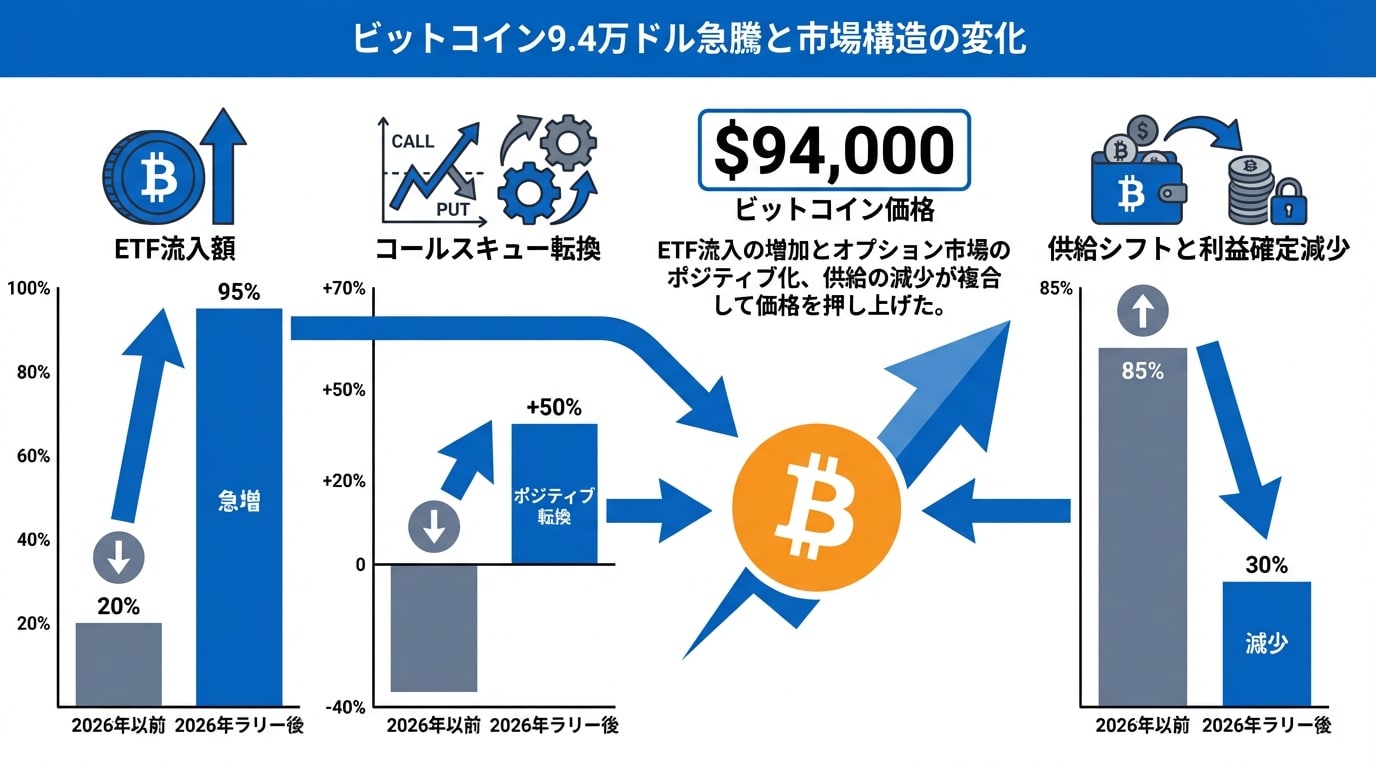 みなさん、こんにちは! 今日も仮想通貨の世界はジェットコースターみたいに動きまくってますね。今回のニュースは、Bitcoinが$94,000まで急騰した話。しかも、重要なメトリックが10月以来初めてポジティブに転じたんです。これ、市場の裏側で何が起きてるのか? ETF流入が$1.2 billion超え、オプションのポジショニングやオン_chain flowsが好転。低レバレッジの構造的な信念が、Bitcoinのラリーを支えてるらしいですよ。結論から言うと、これは単なる価格バブルじゃなく、しっかりした基盤の兆し。でも、もちろんリスクは忘れずに!(約250文字)