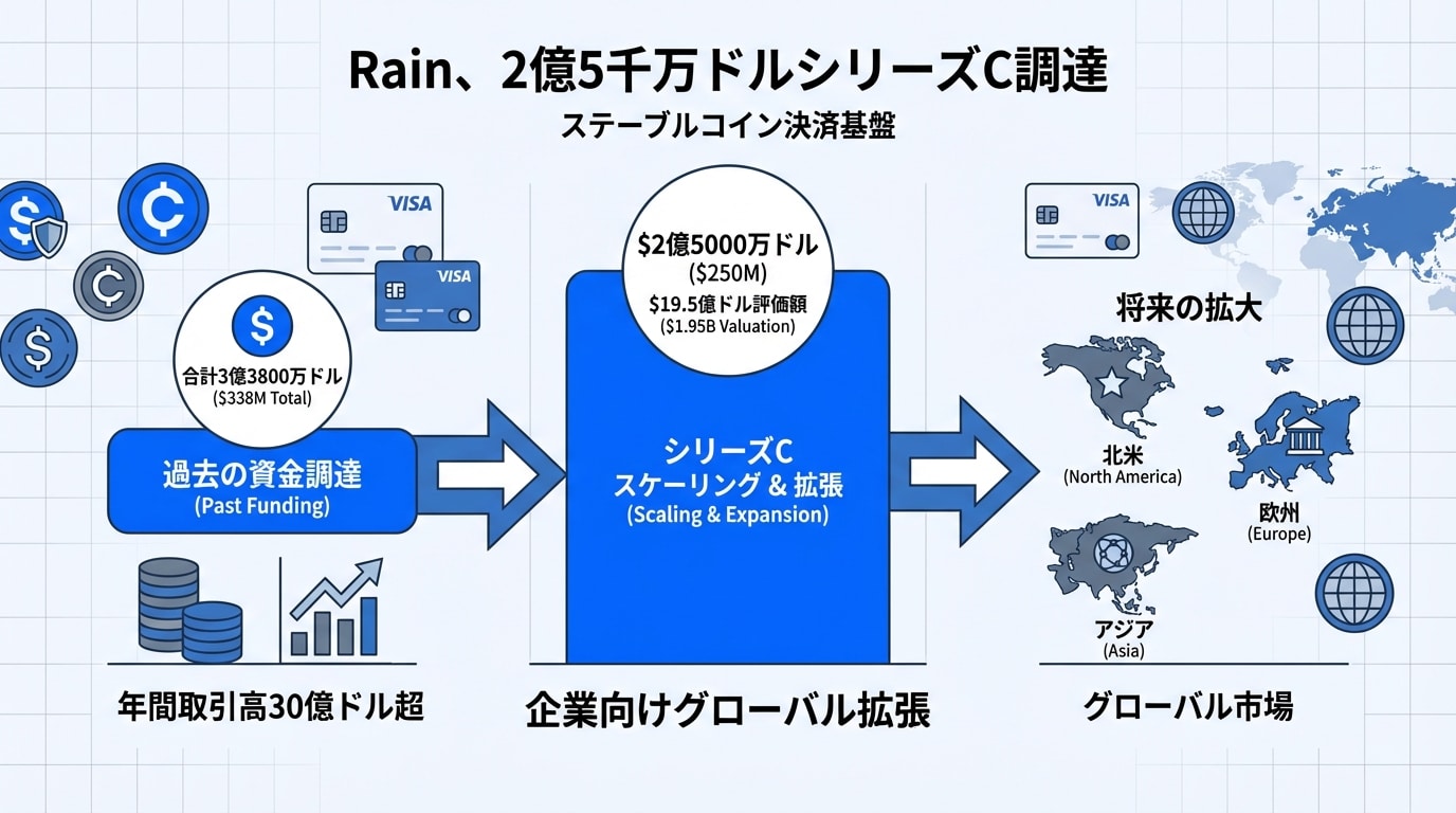 2026年の仮想通貨市場はまだまだ熱い! 特にstablecoin(安定した価値のコイン)が企業向け決済の主役に躍り出ようとしています。そんな中、Rainという会社が$250M(約350億円相当)のSeries C資金調達を発表。評価額は$1.95B(約2700億円)に達し、グローバル企業向けのstablecoin決済インフラを拡大する計画です。これで伝統的な銀行決済の壁をぶち破るかも? でも、リスクも忘れずにね。