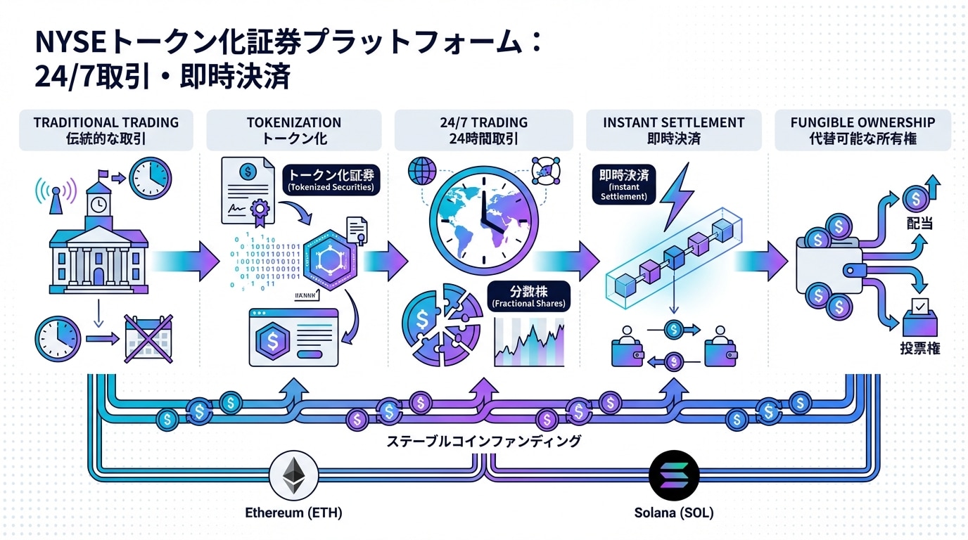 NYSEのトークナイズド証券プラットフォームは、ブロックチェーンを基盤に構築され、トークン化された株式やETFを扱います。これにより、物理的な証券をデジタルトークンに変換し、オンチェーンで取引・決済します。