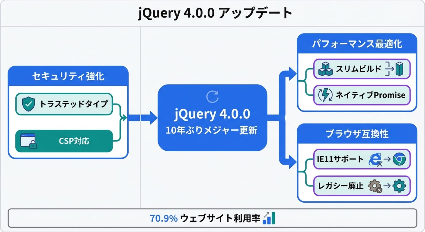 👋 技術者諸君、jQueryの新バージョン4.0.0がリリースされ、Trusted Typesのような先進機能がセキュリティを強化! 古いブラウザの呪縛から解放され、よりモダンなJavaScript開発が可能に。