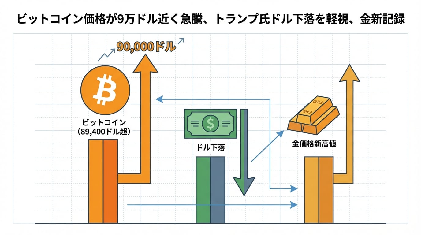 ビットコインが$90,000目前に急騰!トランプ氏がドル安を軽視し、金が新記録更新のニュースだよ。