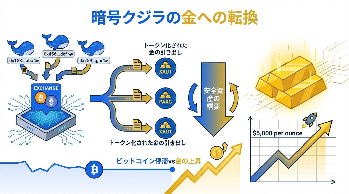 クジラの金シフトは、単なる気分じゃない。オンチェーンデータで大口のBTC売却と金ETF購入が確認されてるよ。