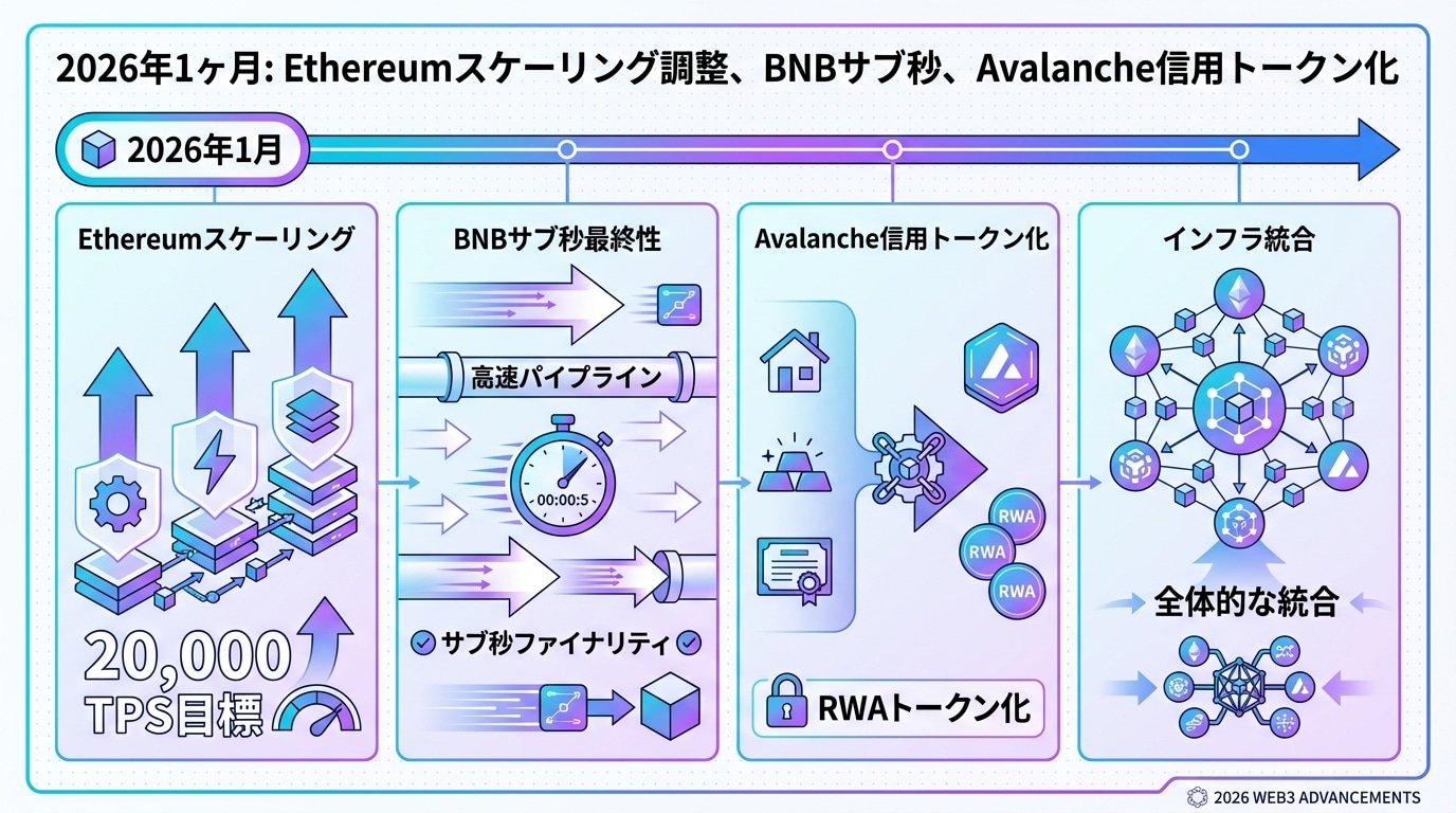 2026年1ヶ月目:Ethereumのスケーリング調整、BNBのサブ秒到達、Avalancheの信用トークン化が示すWeb3の現実進化