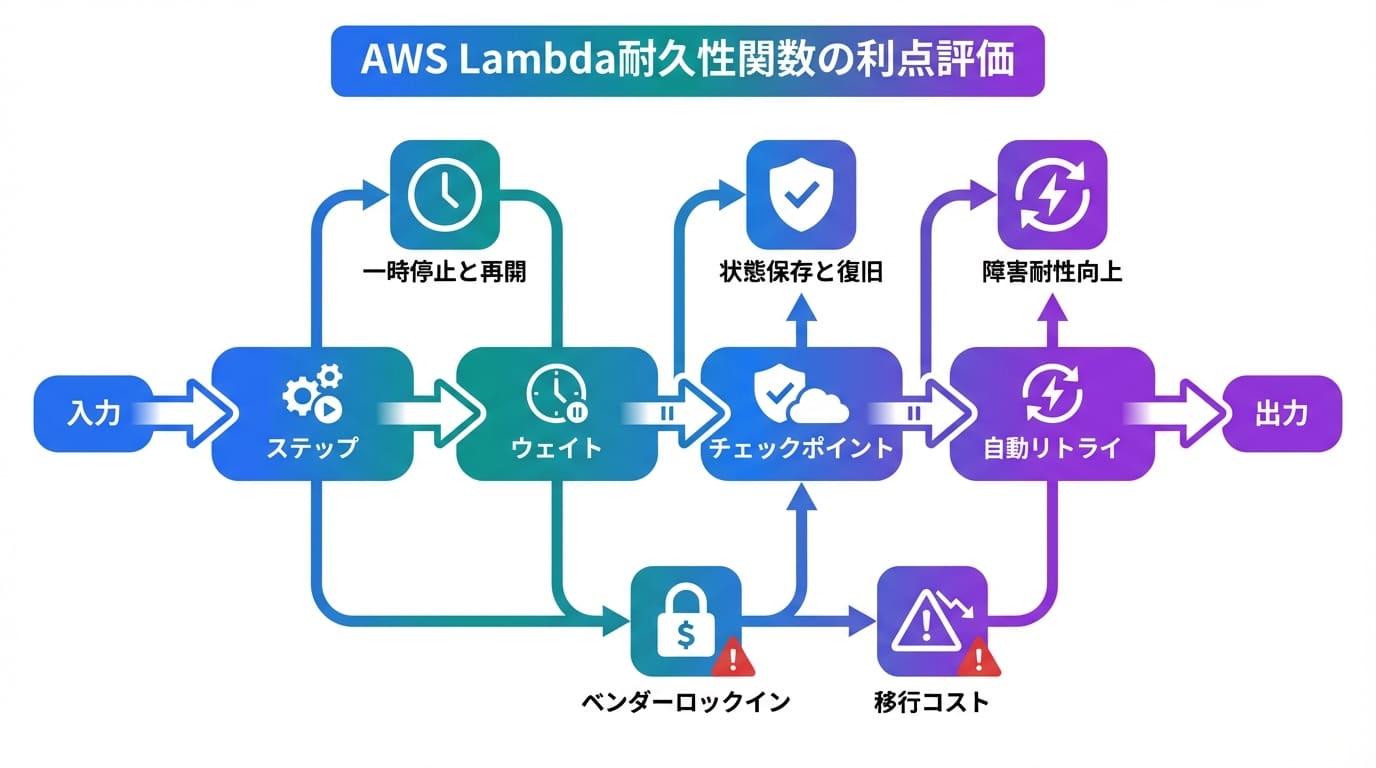 耐久実行機能(Durable Functions)は、Azure Durable Functionsに着想を得たAWS Lambdaの新機能です。関数が中断されても状態を自動保存し、再開時に続きから実行します。