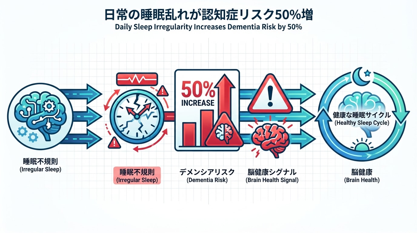毎日のリズム乱れ→体内時計狂う→脳の老化加速→認知症リスク50%高。例: スマホのバッテリーみたいに、充電乱れると寿命縮む。